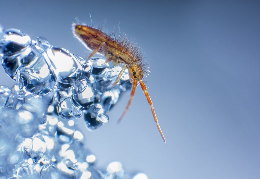 Két-három milliméter – nagyjából ennyi az a világ, amelyben ez a fotó készült. Egy hosszúcsápú ugróvillás, egy pici, de annál szorgosabb élőlény látható rajta, amint épp az olvadó hó felszínén közlekedik. Ez a lény egy lebontó szervezet: az elhalt növényi részeket rágcsálja, nedvesíti, feldarabolja, előkészítve a terepet a baktériumoknak és gombáknak. Az ugróvillások télen is aktívak, főleg este, nappal ugyanis kerülik az erős fényt. Ha hó borítja a talajt, könnyebb észrevenni őket, mert olyankor a testük sötétebb árnyalata kiütközik a fehérségből. Ha nincs hó, akkor marad a földhöz közeli kutatás: leveleket emelgetek, guggolok, hasalok, és ha szerencsém van, meglátom a mozgást a talaj felszínén.