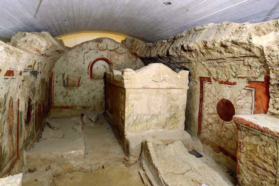 A halottat vagy halottakat a kétszintes létesítmények föld alatti kamrájában helyezték el. Van olyan kripta, amelyben igen drága kőszarkofág áll, de olyan is akad, amelyet komolyan átépítettek a temetkezők. Számunkra különösen fontossá teszi ezeket a sírkamrákat az, hogy a többségüket csodálatos freskók díszítik. Egyiken Ádám és Éva, másikon Noé atyánk, harmadikon Péter és Pál apostolok, negyediken a háromkirályok Máriával, a következőn csak egy Krisztus-monogram, egy másikban férfiarcok, talán az elhantolt családtagok képei.