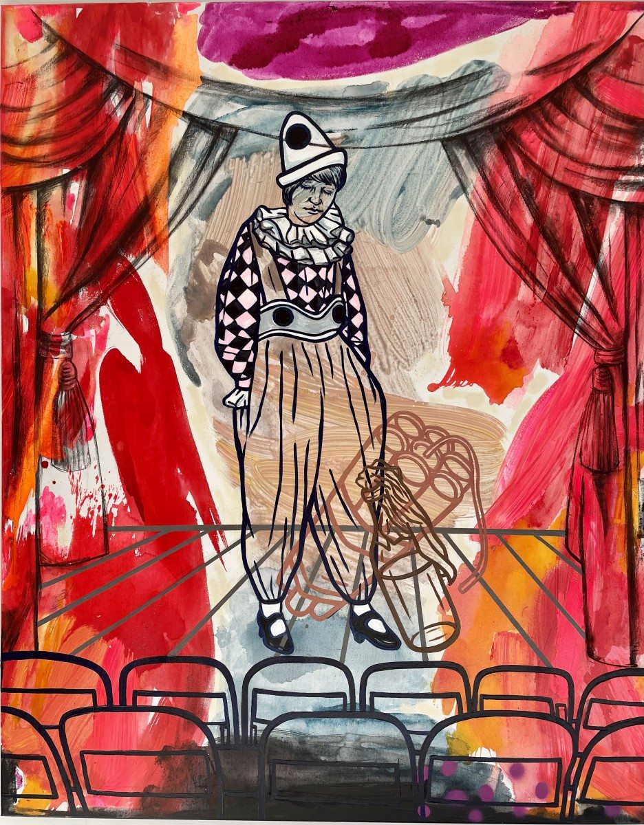 Soós Nóra festményeiről ez a bohóc szól hozzánk, és mutat körbe pandémia és háború sújtotta világunkon. Szembesít a politikai rendszerek túlkapásaival, a fogyasztói kultúra visszásságaival, a rohanás és önzés okozta válságokkal.