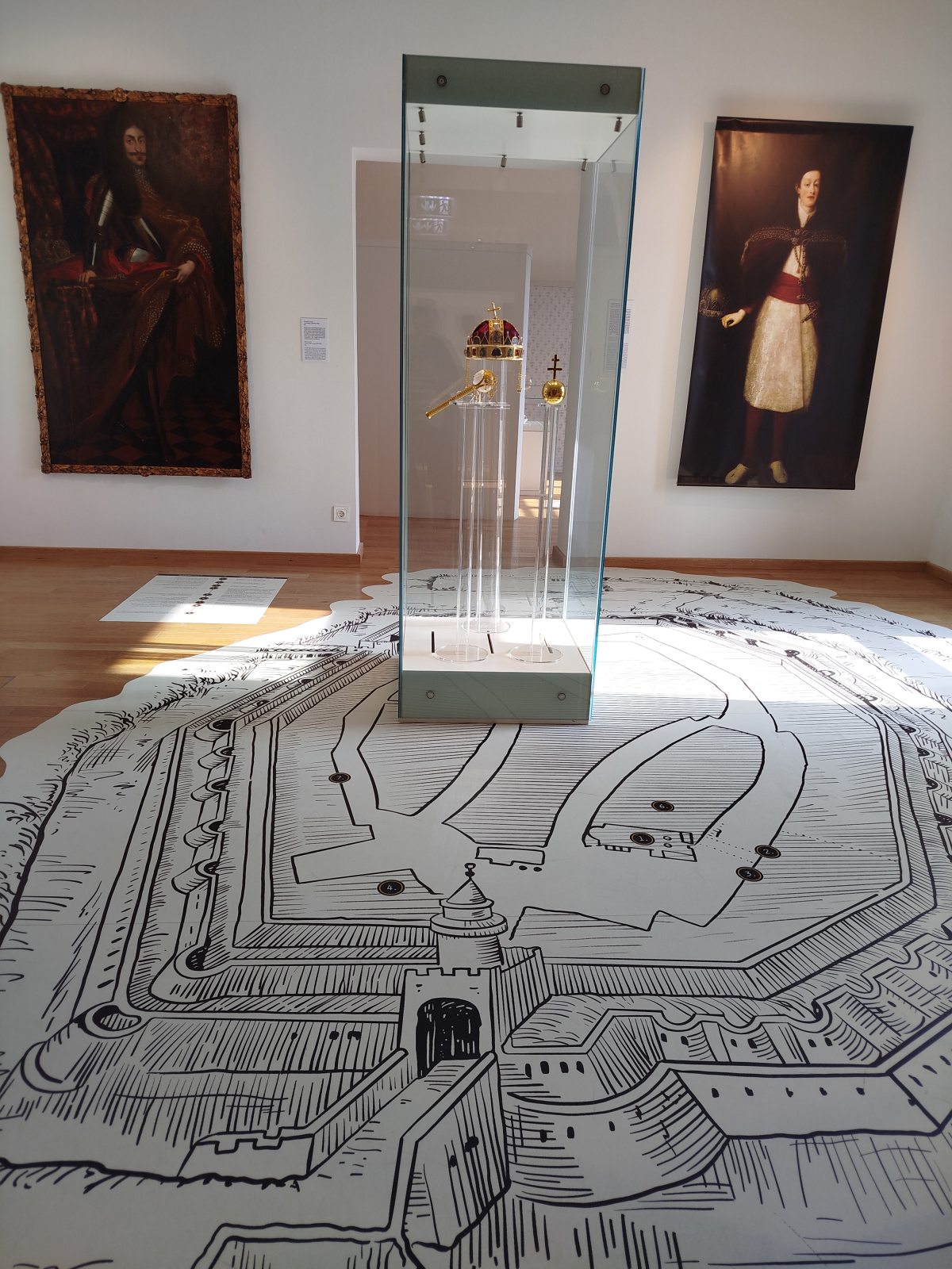 Mátyás aranybullájától II. Ferdinánd meghívóján át az országgyűlésre igyekvők számára készített méretes országtérképig számos dokumentumot lehet böngészni, a padlóra ragasztott várostérképen – a közepén tárló, benne a koronaékszerek másolata – be lehet azonosítani a koronázásoknak helyet adó, egyébként épp a Múzeumnegyed mellett álló ferences templomot, a világi ceremónia helyszíneit, az uralkodói szállásokat vagy épp az országgyűlések helyszíneit. Egy korabeli metszetből animációs film készült, amely megérzékíti, hogyan vonult be 1681-ben a királyi pár és kísérete a koronázásra.