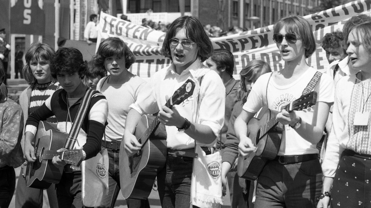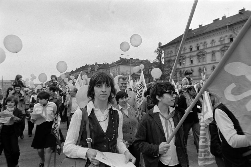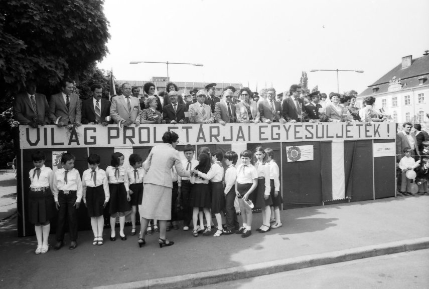Míg a budapesti felvonulás dekorációit grafikusok tervezték, a Fővárosi Kertészeti Vállalat pedig egymillió szál szegfűre kapott megrendelést, addig a kisvárosban az általános iskolai rajztanárok készítették a táblákat. Éljen a KISZ! Éljen Május 1.! Szabad hazában tanulhatunk. Éljen a népek békés egymás mellett élése. Minden évben ugyanaz. Ha egy tábla elkészült, berakták a gépállomás raktárába, hogy aztán jövőre újból elővegyék, nem készültek újabb transzparensek, hiába tett minden évben javaslatokat a Népszabadság.