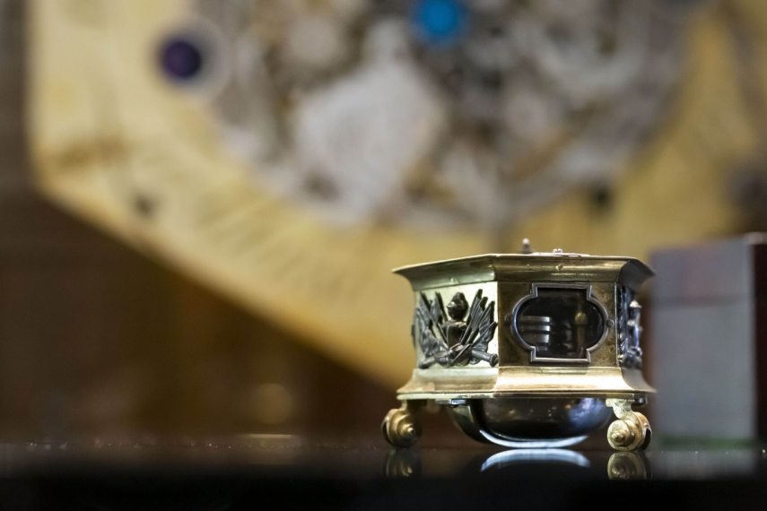 Ezt követően Radnóti Klára kurátor az óra történetének egy rövid részletét mondta el, amelyből az is kiderül, hogy a Széchenyi család időmérőjét egy székesfehérvári óraüzletben egy 1956-os emigráns, Győri György gyűjtötte be, aki az 1970-es években tért haza Ausztráliából Magyarországra. A kurátor a műszert úgy jellemezte, hogy egy nagyon érdekes darab, a 17. század elejének formáját mutatja, de a rajta lévő mesterjelzés ennek ellentmond, így sok kérdést vet még fel.