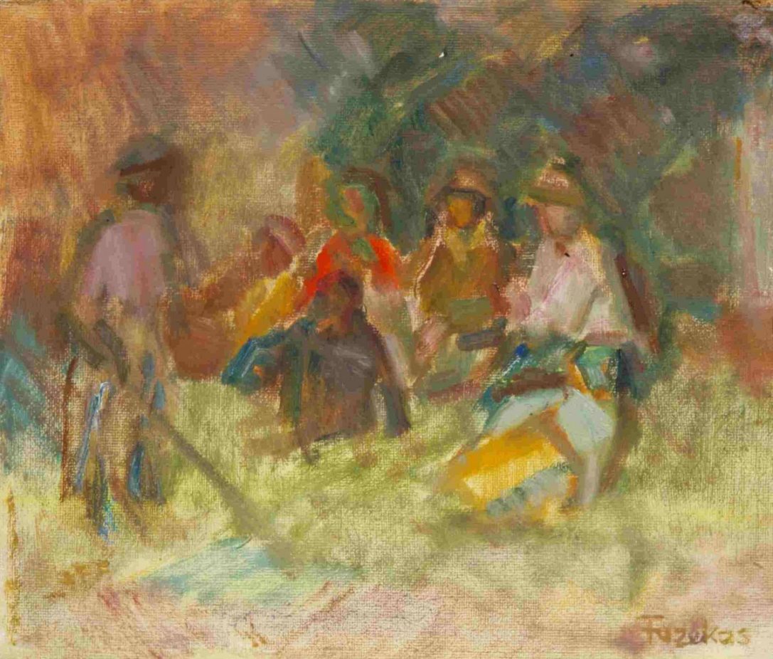 Ez a kép a Szolnoki Művésztelepen készült, évtizedekkel ezelőtt. Egyszer kimentem a kertbe, és megláttam ezeket az embereket. Ha jól láttam, olyan negyven-ötven év körüliek lehettek, de volt köztük fiatalabb is. Megtetszett az összkép: a színek, és ahogy ott ültek. Előtte kertészkedtek, a kertet takarították. Nem ismertem őket, és szerencsére észre sem vették, hogy megfestem őket.
