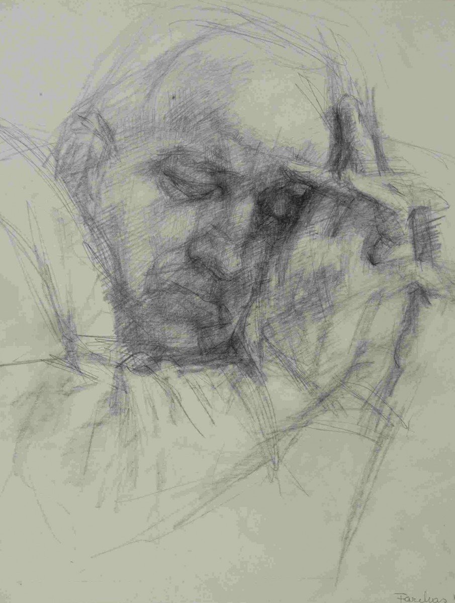 Ez a kép a férjemet ábrázolja. Megragadott, ahogy aludt. A portré mindig érdekelt. Már a főiskolán is nagy hangsúlyt fektettek rá, hisz az emberábrázoláshoz a portré és az akt is szükséges. A portréban az ember lelke izgat. És ha az alany sokáig ül, egy idő után a lelkében lévő dolgok megjelennek az arcán. És ez is portré, mert az alvó arcon is átsugárzik a lélek.