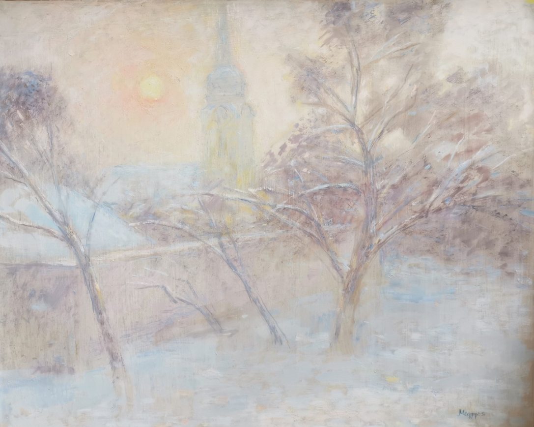 Ez a férjem képe. Annyira szép! A művésztelep kertjében készült. A festmény remekül visszaadja a párás fényt, amelyen a nap átsugároz. A téli fényeket jól ellensúlyozza a vöröses. A fény finom, nüansznyi módon van ábrázolva, és számomra attól gyönyörű ez a kép, hogy érződik rajta: az alkotó átélésből dolgozott.