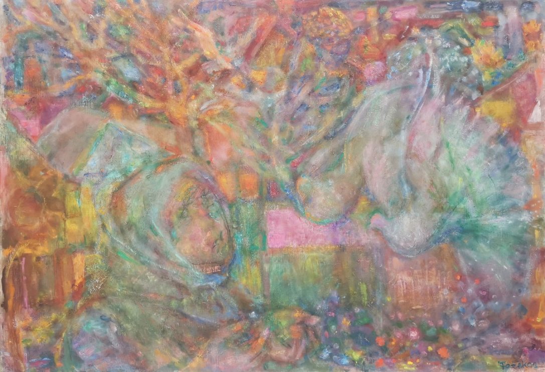 Ez a legújabb képem, amelyen galambok szállnak, és egy nő hívogatja őket. A háttérben fás terület van. Egy régi élmény emlékéből született. De minden festményem élményből fakad. Azt festem, ami épp megragad. A természet gyönyörűsége különösen, mert mindig feltöltődöm tőle. Ebbe a képbe még mindig bele tudnék nyúlni, de nem szabad, mert egységes hangja van.