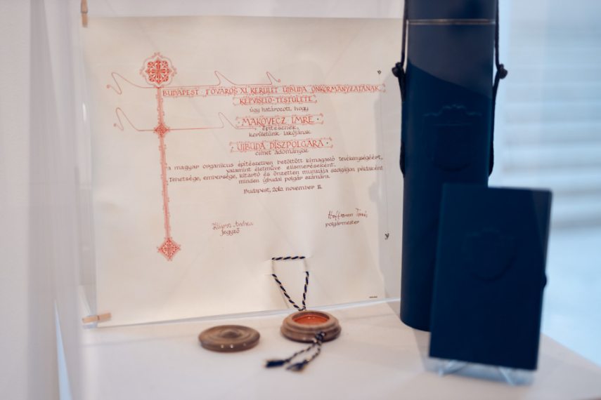 Életem során mintegy száz-százhúsz különböző díszoklevelet készítettem neves művészeknek, sportolóknak, íróknak, tudományos szakembereknek. Valamennyit borjúpergamenre, iniciálékkal, kalligrafikus betűkkel, kézírással írtam. Mindegyikhez bőrrel bevont, bársonybéléses tok dukált. Amikor az ünnepeltek megkapták őket, mindig meghatódtak, láthatóan nagy örömöt szereztem nekik velük. Az elismeréseik sokat jelentettek nekem. A kiállításon Jankovics Marcell és Makovecz Imre díszpolgári oklevelei láthatók.
