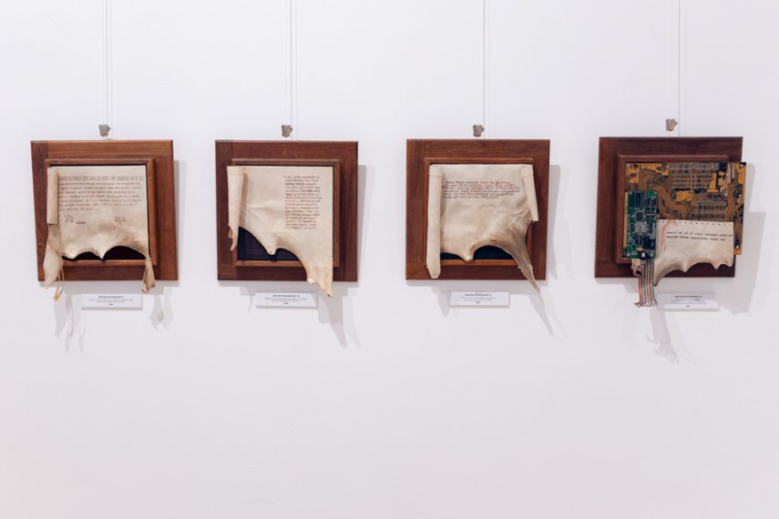 A Magyar nyelvemlékek sorozatban A tihanyi apátság alapítólevele, a Halotti beszéd és az Ómagyar Mária-siralom egyes részleteit írtam az általam kikészített kecskepergamenre, betűhív kézírással. A negyedik darab a Krisztus után a 21. századból címet viseli. Ezen a faliképen – amelyet természetesen ironikusnak szántam – számítógépes panelből és nyomtatott áramkörből „írtam” modern iniciálét kecskepergamenre. Egyszer majd ez is a magyar „nyelvemlék” része lesz, bizonyítékul szolgálva arra, hogy mennyit romlott a nyelvünk.