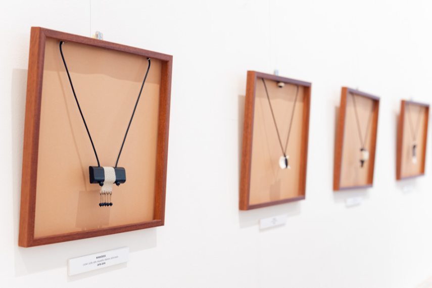 A kiállított nyakékek a bőr és a csont sok tízezer éves történetére utalnak vissza. Elődeink az állatok leölését követően a bőrön túl a csontokat is hasznosították: különböző szerszámokat, fegyvereket készítettek belőlük. Ezeknek a korai eszközöknek az archaikus formái jelennek meg az általam készített nyakékeken, amelyekhez fonott bőrrel, ébenfával, szőrrel társítottam a megcsiszolt, polírozott csontokat.