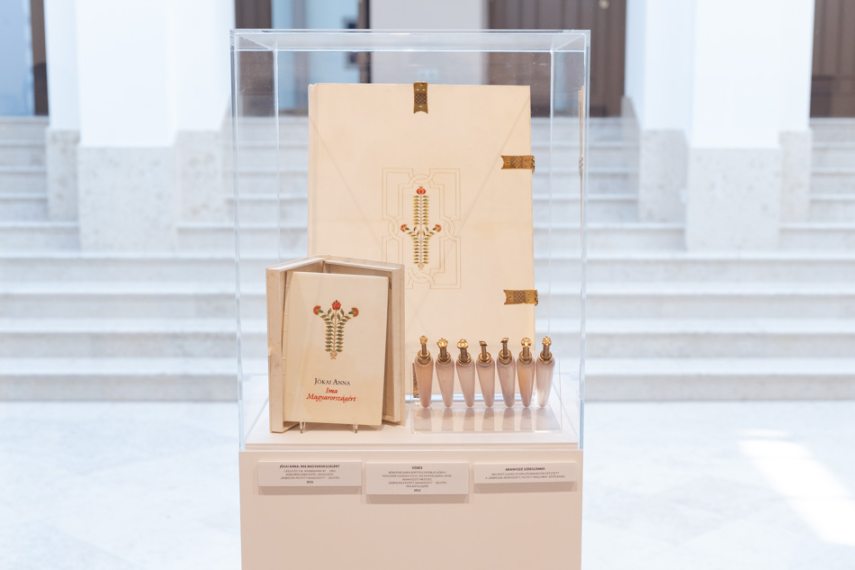 A könyvkötészet mindig is érdekelt. Történetével és a kalligráfia különböző ágaival is szeretek foglalkozni. A kiállításon látható, nagy méretű kódex díszítéseinek megalkotásához például a Debreceni Református Kollégium könyvtárában kutattam. Debrecenben a 18. században nagy hírű mesterek dolgoztak, az általuk használt motívumkincset másoltam le és használtam fel. Rajzaimból Gulyás István vésnökmester készített a munkáimhoz aranyozószerszámokat, ezek is láthatók a kiállításon. A kódexet és Jókai Anna könyvét is borjúpergamennel vontam be, majd festett, aranyozott motívumokkal díszítettem őket. Úgy gondolom, hogy ezek a munkák méltó utódai a debreceni festett pergamenkötésű könyveknek.