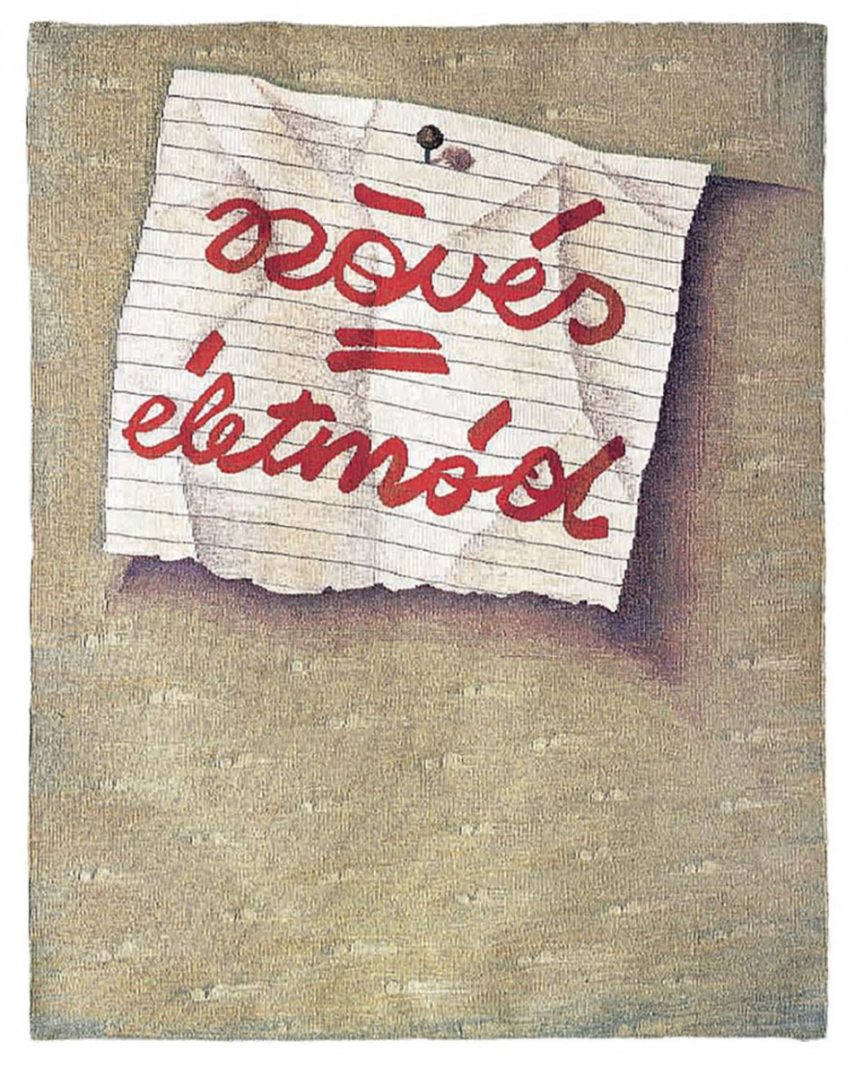 Én válaszul egy kitépett, gyűrött, csíkos irkalapra fölfirkáltam, hogy Szövés = életmód, fölszúrtam a szövőszékem oldalára, és ezt a fiatalos kinyilatkoztatást szőttem meg a gombostű és a papírlap vetett árnyékával együtt.