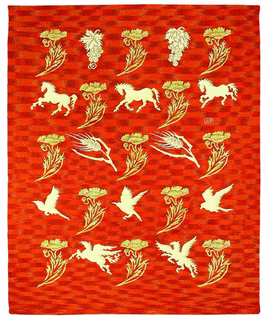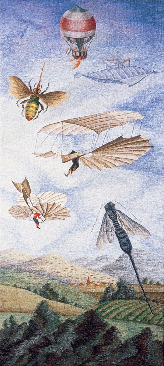 Aztán a szerencse mellém szegődött: a helikopter feltalálójának, Kármán Tódornak a tiszteletére nagy méretű kárpit tervezésére és szövésére kaptam megbízást, így nem kellett hátat fordítanom az addig oly kedves modelljeimnek. Más léptékben, de beemelhettem őket a kitágult térbe, az ember által alkotott repülőalkalmatosságok mellé.