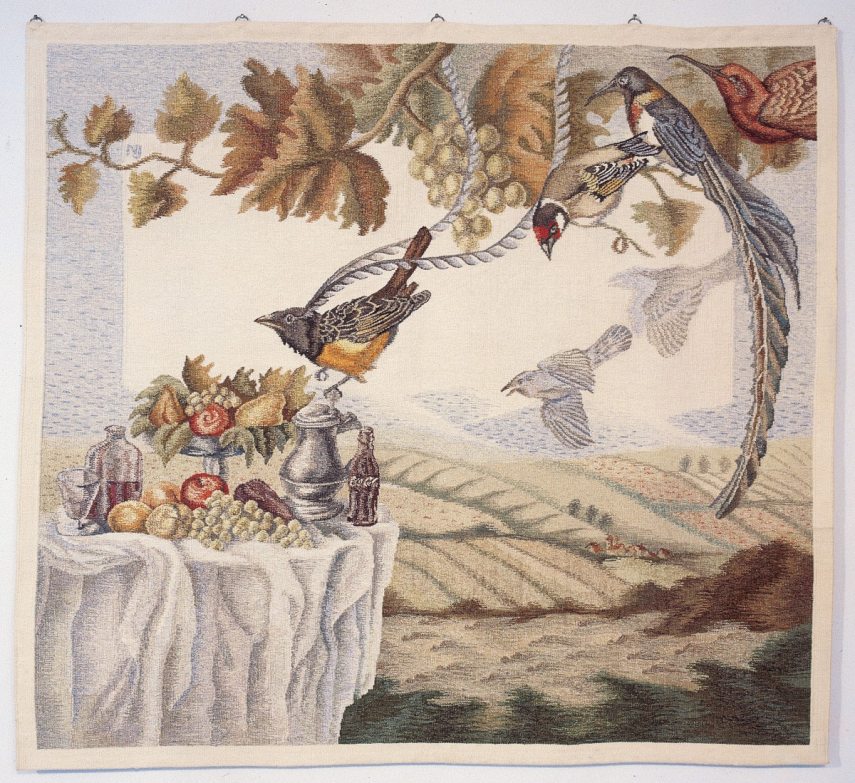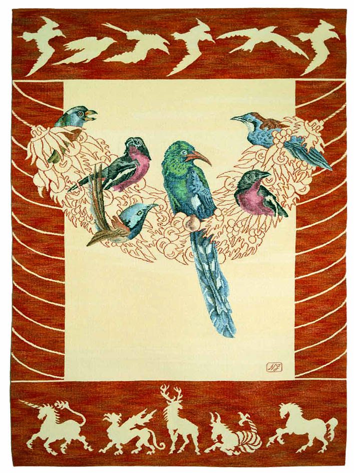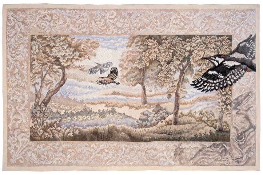 Egyik kedvenc kárpitom a kertünkben zajló történet megörökítése: szerelmesen röpködő madárpár, amelyet persze figyel a kompozícióba berepülő veszedelmes szajkó, de a gobelin selyembordűrjébe finoman belerejtett, lesben álló cicám portréja okán még ő sem érezheti magát nagyon biztonságban.