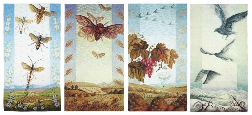 Négy gobelin az évszakokról: a kert, a kirándulások emlékei, virágzó tavasz, szitakötők, búzamezők, kabócák, termőföldek, hó, varjak, Vivaldi…