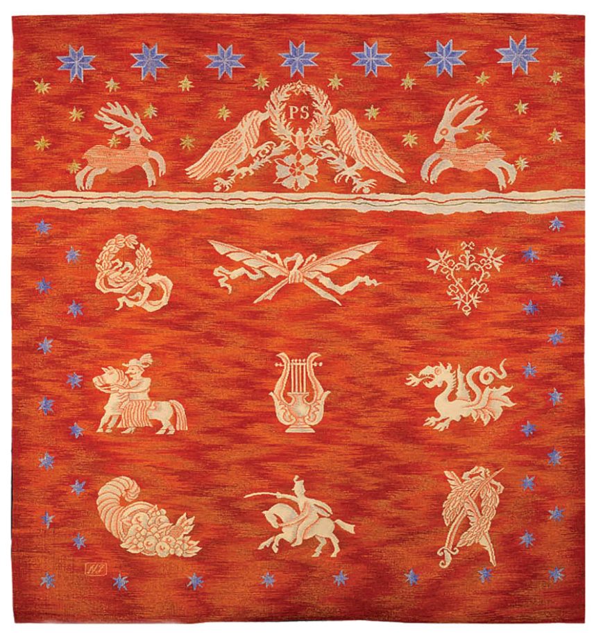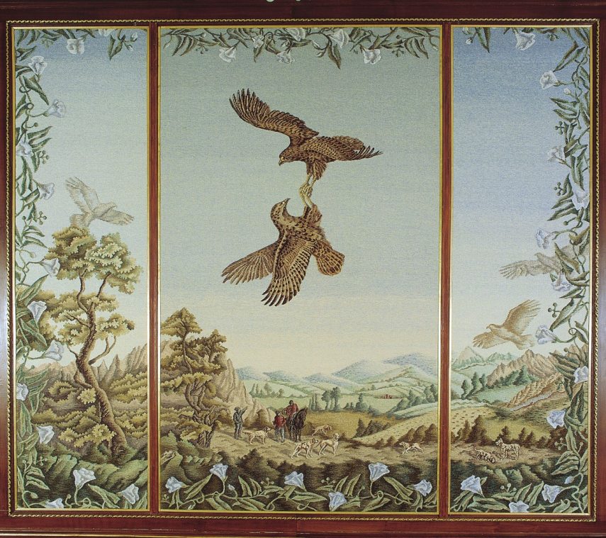 Majd jött a nagy ajándék, a nagy feladat, a színes korszak koronája: a Benczúr (Postás) Palota kárpitegyüttese két nagyméretű művel a kandallók fölé, és az igazán hatalmas triptichon, a Vadászjelenet. Ez a munka az architektúra része, megnyitja a sötét terem falát. A horizont szemmagasságban, a vadászatra induló társaság a kutyákkal a kompozíció alján, az íriszesen kékbe hajló ég közepén egy óriási, egymásba kapaszkodó ölyvpár tépi-szereti egymást. Mindhárom mezőt növényinda futja körbe fehér virágokkal.
