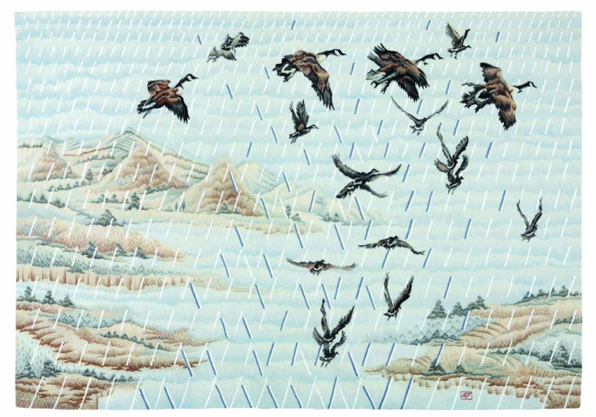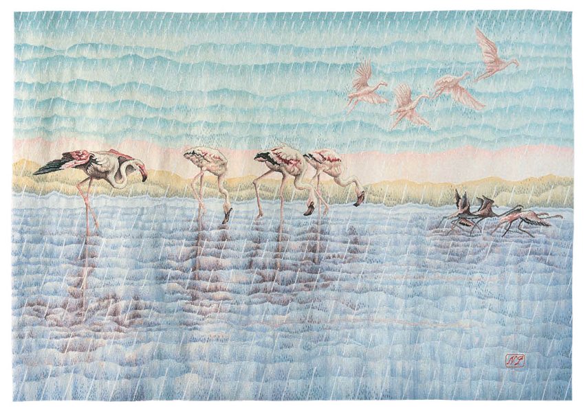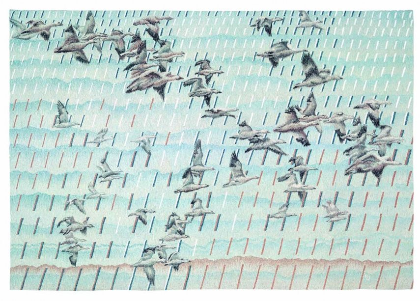 Aztán három darabból (Flamingók, Vadludak, Vadkacsák) álló, nagy méretű, madaras kárpitsorozat következett; itt a horizontális, a vertikális és az egy pontból „kirobbanó” mozgások ábrázolásával játszottam.