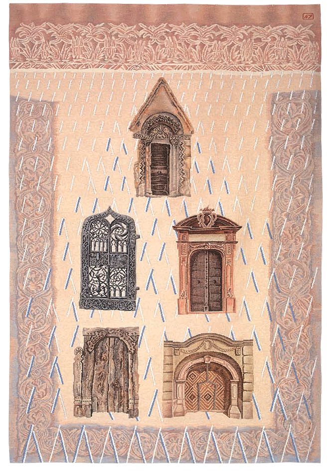 Az én kárpitom címe a Himnusz-kapuk volt: ünnepi textilfelajánlás, mint a régi korok asszonyaié nagy alkalmakra. Magyarország „Veronika-kendője”: erre gondoltam a tervezésnél. Öt, az aranymetszés szabályai szerint elrendezett, Magyarország történelmét szimbolizáló épületkaput szőttem Szent István kőszarkofágjának finom alapszínéből. Legfelül a kicsi, román stílusú csempeszkopácsi templom kapuja hasítja az eget. Alatta balra áttört, gótikus kovácsoltvas kapuszárny, mellette pompás, vörös márványból készült reneszánsz–barokk kétszárnyú kapu hercegi címerrel díszítve. Az alsó, bal oldali, parasztos fakapuzatot baltával és szekercével faragták ki. Az utolsó stáció klasszicizáló, késő rokokó polgárház bejárata, ami aztán sok történésre „kaput nyitott”. Az egész kompozíciót U alakban, bordűrként öleli körbe a román kori fonaldíszek sora, és felül faragott kőcsipkeminta zárja.