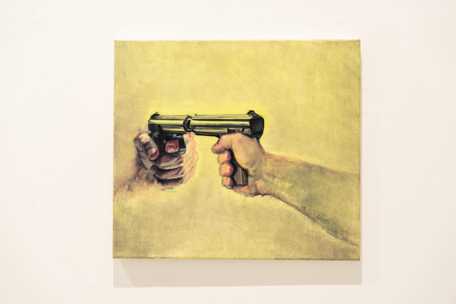 Első pillantásra igéző, éteri, „felhős” képekkel találkozunk, amelyek derengő színvilága szelíden hívogató, szinte hipnotikus. Közelebbről azonban a jelenetek kísértetiessége válik láthatóvá: ezek a festmények először beszippantanak, majd amikor felismerjük, mit is látunk valójában, hirtelen visszariadunk. A művek tükröt tartanak elénk, és kíméletlenül rádöbbentenek arra, hogy a fenyegetettség, amelyet érzünk, sokszor saját cselekedeteinkből fakad. Mi szegezünk fegyvert egymásra – és önmagunkra. A képeken felvillanó részletek tovább erősítik ezt a baljós tónust.