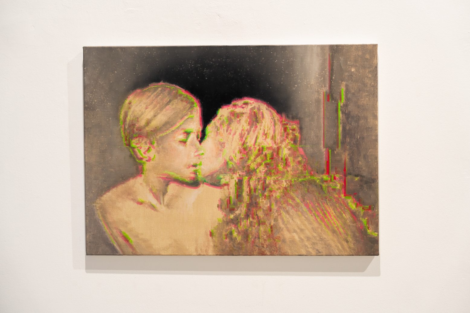A Complementary Love egy intim csókjelenetet rögzít, amelyet azonban digitális zajokra emlékeztető zöld és piros sávok torzítanak el. A békés, idilli pillanat úgy hat, mintha sérült adatfájlból vagy egy közvetítő médium torzított képén keresztül jutna el hozzánk: a szerelem képe instabil, percek alatt széteshet. Több új festmény is hasonló logikával működik: a képhiba Szűcsnél nem vizuális effektus, hanem az identitás, az emlékezet és a jelenlét mulandóságának lenyomata, amely egyúttal a mozi világára – különösen David Lynch és Ingmar Bergman szürreális, lebegő atmoszféráira – is reflektál.