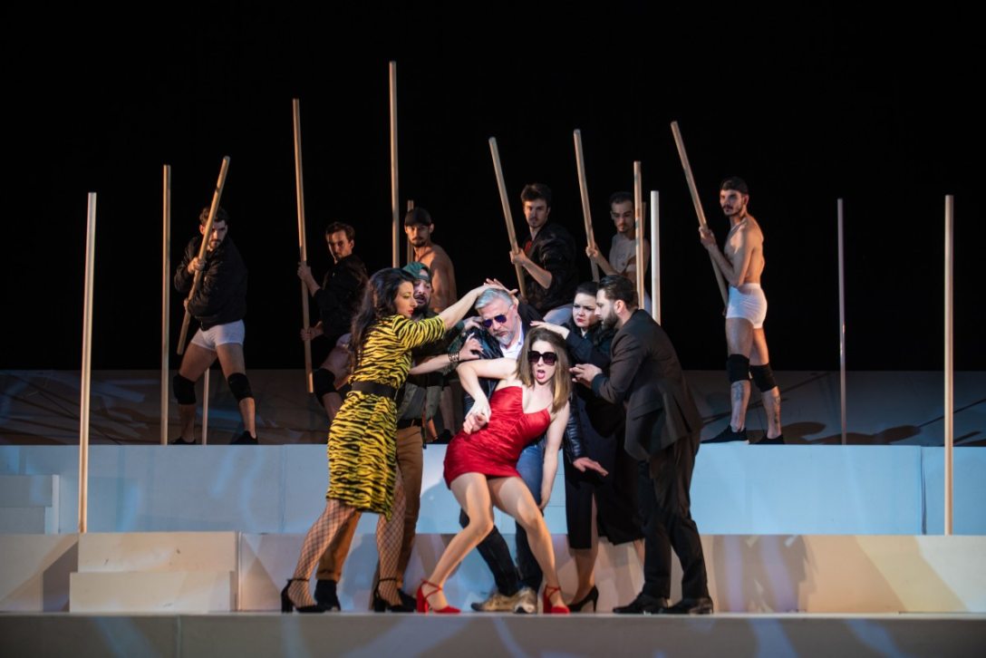 A dramma giocoso ötletes színrevitelében egészen magával ragadó a könnyedség, a játékosság, amely még a tragikus jeleneteket is áthatja. A puritán, fehér lépcsős színpadot földbe állított farudak szabdalják (díszlet: Kiss-Benedek Kristóf, Kalászi Zoltán), amelyek időnként egy kert rejteket nyújtói fái, máskor a menekülést elzáró falak, egy rejtekajtó, a földből kihúzva pedig Leporello elverésének eszközei, a Masettót támogató mankók vagy a vacsorára feltálalt „nők” tálcái. Ahogyan az említett Fuharosokban az óriási labdák és a talicskák, itt ezek a botok teremtik meg az előadás teljes eszköztárát, és a leleményességnek hála a második felvonás végén is izgalmas, változatos közeget biztosítanak.
