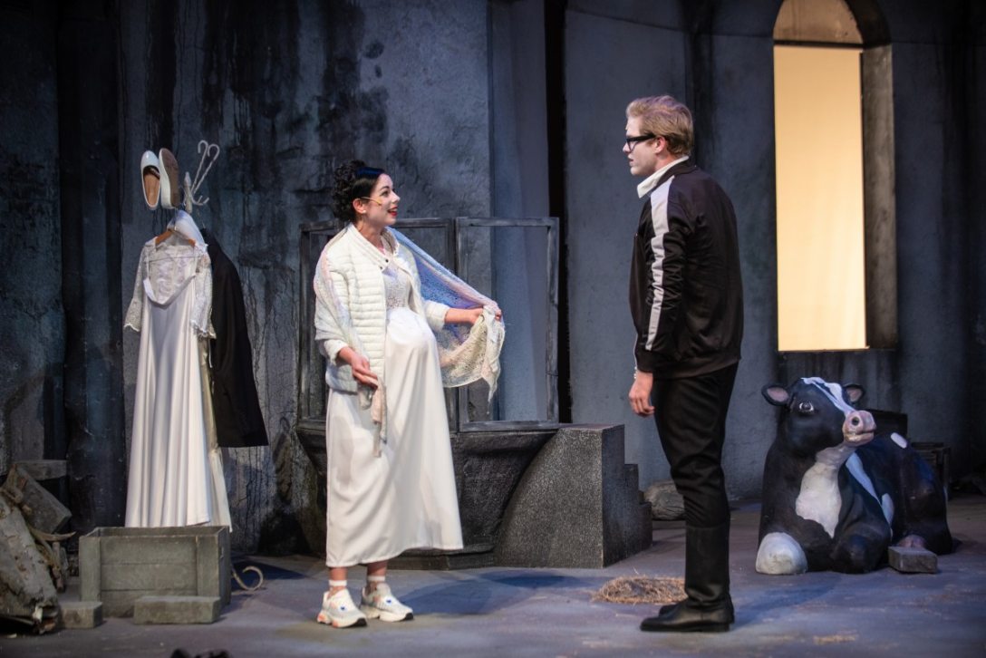 A várandós nő világító hasa, a cowboy ruháján villódzó neonfények akár közönséges vagy profán hatást is kelthetnének, ebben az elrajzolt világban mégis szerves részei egy történet szórakoztató elmesélésének. Ahogyan a romos kápolnabelsőt idéző istállóban kontrasztos a földre szórt szalma és trágyahalmok fölött húzódó boltívek valaha volt szépsége (díszlet: Fodor Viola, jelmez: Papp Janó).
