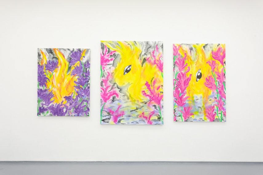 A kiállítótérbe lépve Lakatos Gelléri Barnabás három festménye vonzza magára a tekintetet. Munkái triptichonként hatnak a szemben levő falon, ami egyfajta szakralitást is kölcsönöz nekik.