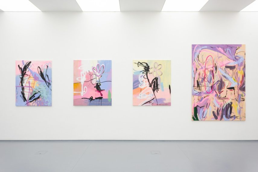 Az MHM(!) címűn például ösztönösnek ható rózsaszín vonalstruktúra uralja a látványt. Ez az olykor hurkokat felvevő alakzat a képen kalligrafikus jellé alakul, ami azonban olvashatatlan a néző számára. A kiállítás leírásából kiderül, hogy Kiss Fruzsina műveinek fontos forrásai a kézírásos feljegyzései, valamint hogy az alkotó izgalmasan szintetizálja az automatikus írást a gesztusfestészettel. Az így létrejövő kompozíció rendkívül dinamikus és felszabadító, míg az alsóbb rétegek még őrzik a figuralitás nyomait. A már említett képen például virágrajzok, felhőre emlékeztető ábra és a napot idéző, szaggatott vonalas struktúra tűnik fel, amelyek történetet akarnak mesélni. Általuk a néző fejében is narratíva születik.
