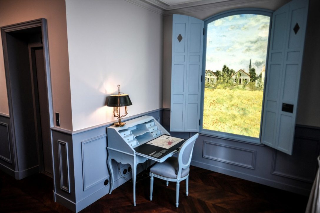 A bútorokat régiségkereskedésben szerezték be, majd átfestették. A fiókokban és az ál-beépített szekrények mögött festmények, illetve kézzel írott levelet másolatai láthatók. Minden helyiségben visszafogott hangulat uralkodik: a falaktól a bútorokig minden az impresszionizmus jellemző égkék, őszibarack vagy piszkos rózsaszín árnyalataiban pompázik.