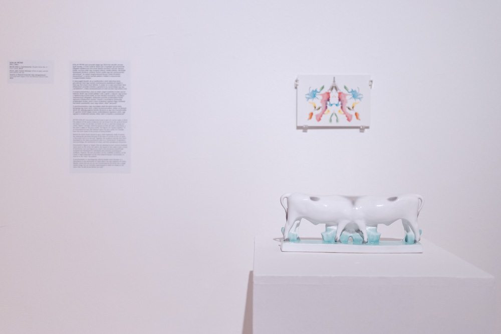 Szabó Eszter Ágnes falvédői a régi idők hangulatát közvetítik, kompozíciói, feliratai (Amikor nagymamám, Zalai Imréné találkozott David Bowie-val) pedig a popkultúra primer nyelvét imitálják. Szalay Péter Kettős látás 3. Szürkemarha című festett szobra a kispolgári giccsek, a nippek világából merít, az alakok tengelyszimmetrikus összenövesztésével pedig megmosolyogtatja a látogatót.