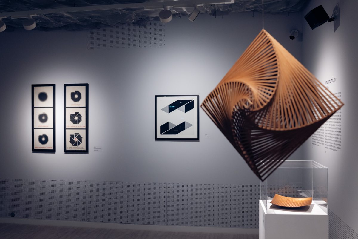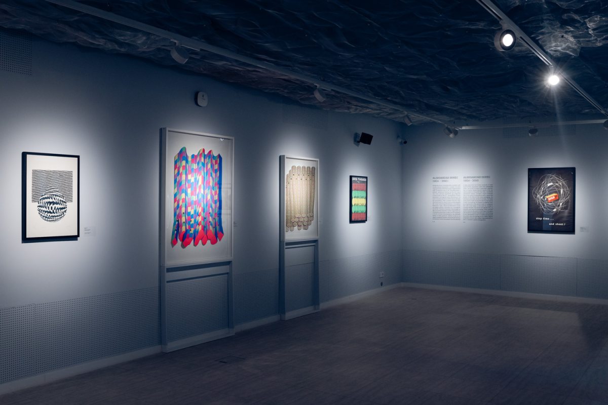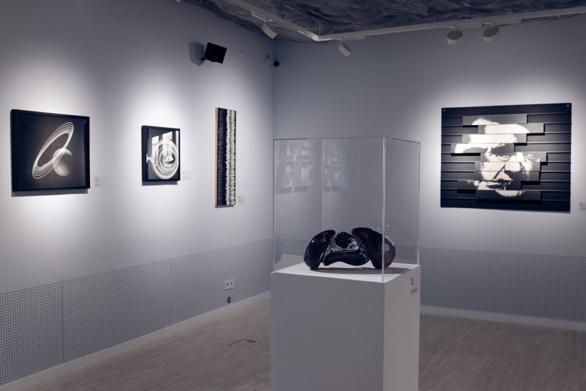 A másik oldalon Miroslav Šutej alkotásai emelkednek ki a sorból, vibráló színeik szinte pszichedelikus látványt hoznak létre. A modulárisan kollázsolt művek provokációnak tűnnek, hiszen Šutej olyan optikai hatásokat generál, amelyek folyamatos mozgásban tartják a retinánkat. Nyughatatlanul próbáljuk kifürkészni, hogy a geometrikus motívumok sokszorosításán és váltakozásán alapuló művek milyen rend szerint épülnek fel, miközben a tiszta, olykor már neonos árnyalatok egymásmellettiségéből fakadó vibrálás szinte teljesen magába szippant. Getulio Alviani G2021 című műve a gravírozástól válik kinetikussá, hiszen az egyes sávokat a művész úgy alakította ki, hogy a néző mozgásától maga az alkotás is „beindul”, és olyan érzést kelt, mintha alagút vezetne a belsejébe.