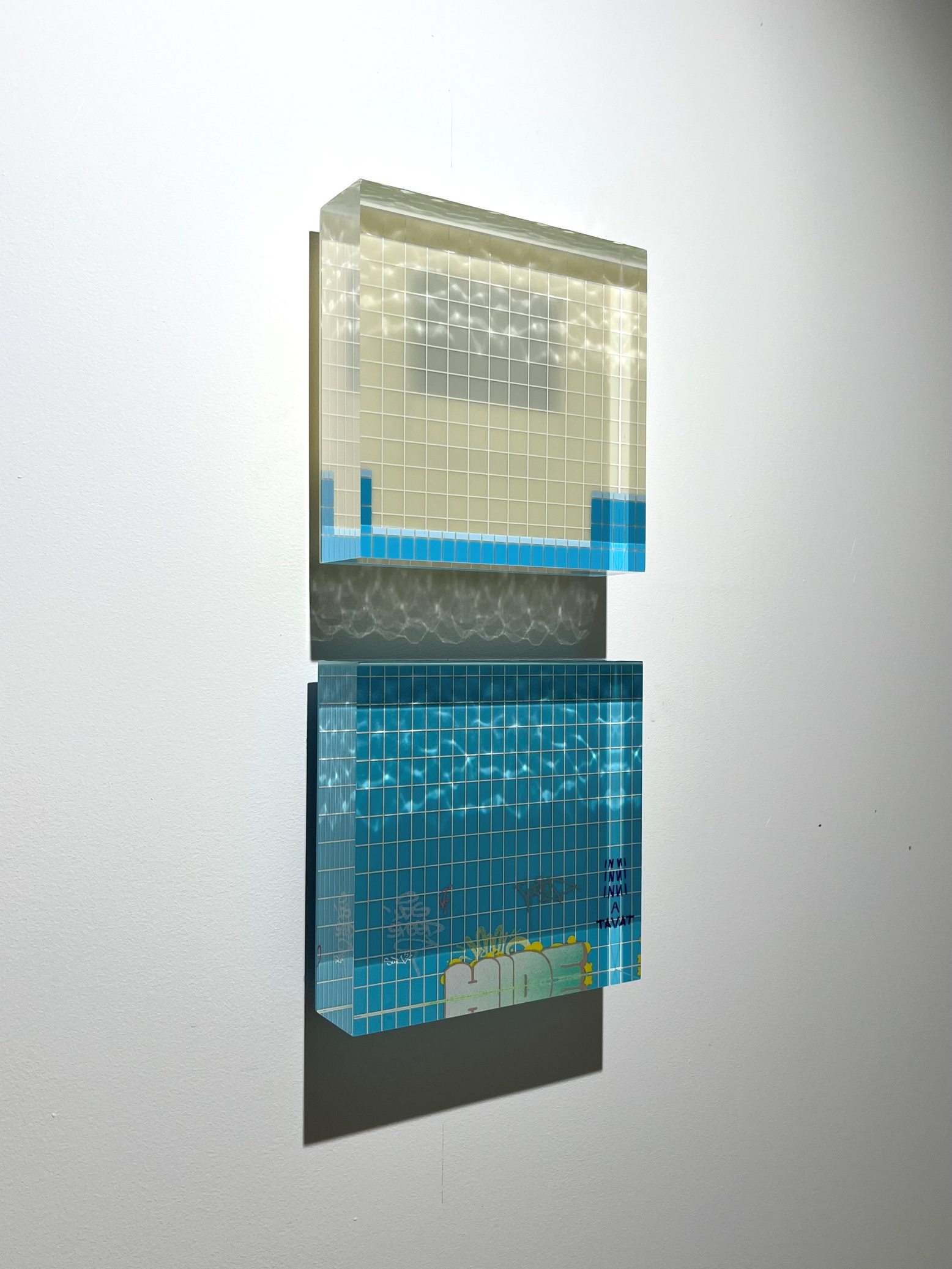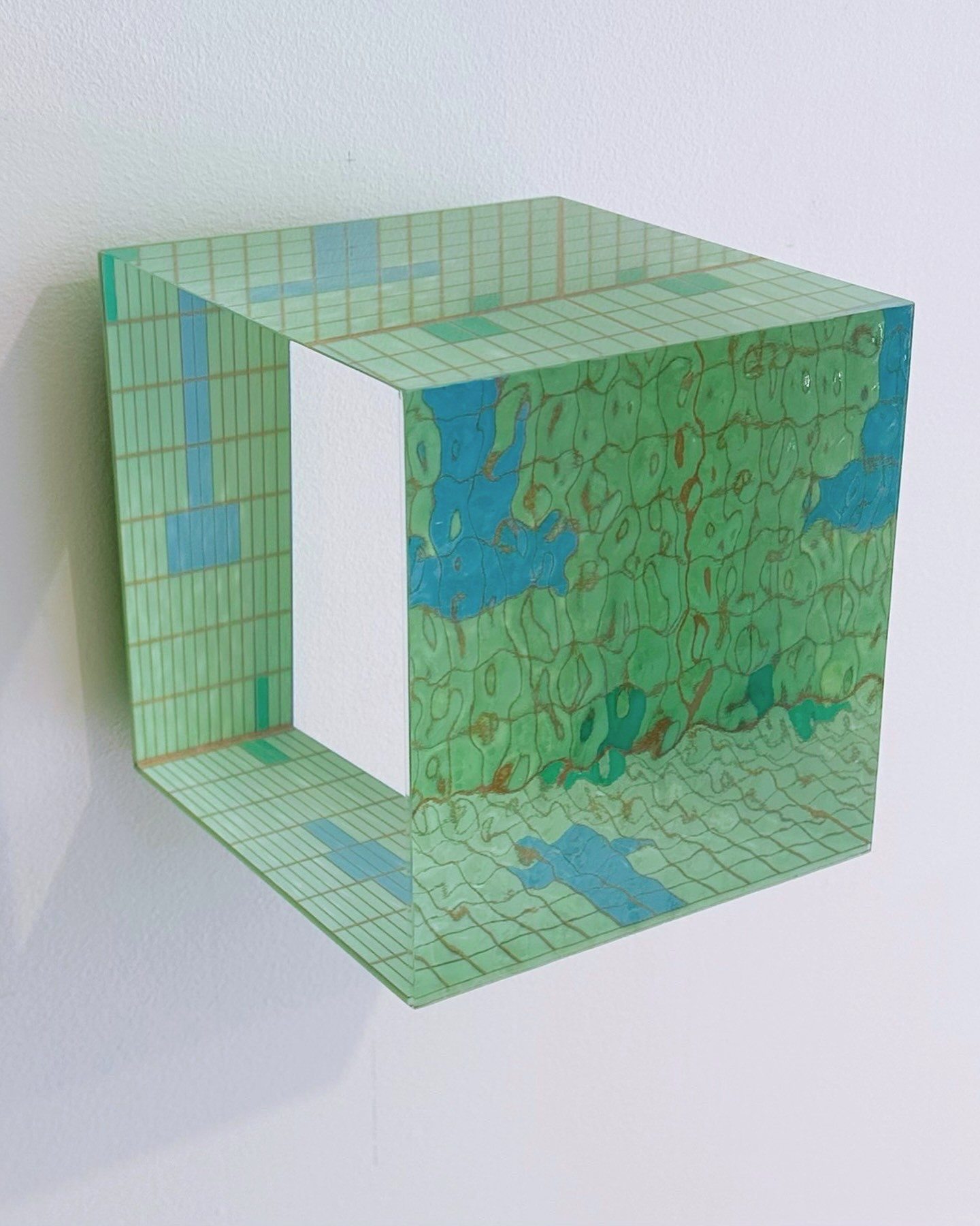 A tárlaton díjazott, SZUE című alkotása a Szegedi Úszó Egylet medencéjét idézi. Az üveg felületén megjelenő hullámok és fénytörések, akár a víz felülete, torzítják, organikussá teszik a szabályos négyzeteket. Művének célja, hogy interakcióba vonja a nézőket úgy, hogy a térbeli helyzetük megváltoztatásával a tárgyban zajló mozgás illúzióját keltse. Mintha a víz hullámai kerülnének kölcsönhatásba a medence csempézetével.