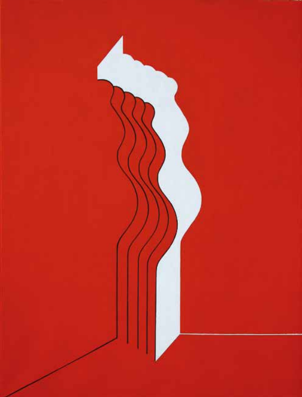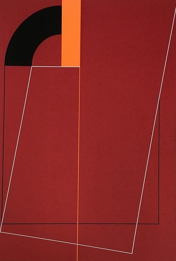Ez a nagyméretű, vörös színű festmény felületében is számos izgalmat kínál a szemnek: a szemcsés felszín játékossá teszi a művet, miközben egyfajta kozmikus érzetet is kelt. Az erre kerülő fehér vonalak, a fekete félkörös forma és az élénk sárga négyszög allegorikus jelentéssíkokat csempész a mértani formák dimenziói közé. A befogadóban e kompozíció hatására történetek képződnek.