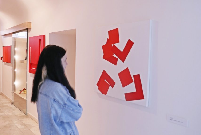 A szűk folyosón most főként olyan munkák láthatók, amelyek esetében dominál a piros szín. Izgalmas felülete van Jacob Gasteiger I.2.2005. képének, ami felidézi bennünk az átgereblyézett földek esztétikáját, Klaus Jürgen Schoen festménye pedig a piros különféle árnyalatait egymás mellé helyezve igen érzéki és vibráló hatást vált ki a befogadóban.