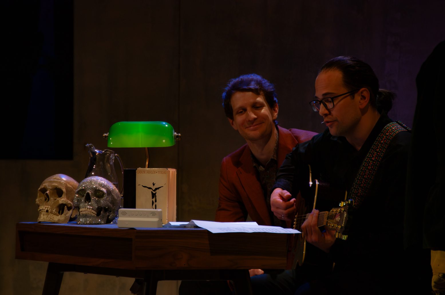 A színpadképet Gábor Miklós eredeti jelmeze díszítette, majd több izgalmas relikviát is bemutatott Zoltán Áron. A sorozat társszervezője, az aktuális tárgyakat prezentáló és közismerten muzikális Mátyássy Bence ezután gitárt ragadott. Az előadás egyetlen zenei betétjeként dalba foglalta azt a mintegy hatvan előadóművészt, akik az utóbbi évtizedekben közönség előtt tették fel a létezés és a nemlét viszonyára vonatkozó közismert kérdést. Ezután megérkeztek a vendégek, és ezzel el is dőlt, hogy a Hamlet-talkshow kezdeti lendülete biztosan nem ül le a remek kezdés után.