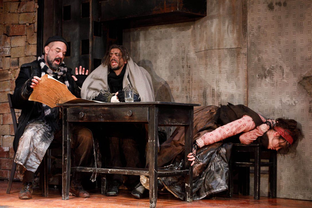 A társulat egy vendégművésszel és négy egyetemi hallgatóval kiegészülve remek összjátékban teremti meg az ismerős, abszurd közeget. Többnyire alig néhány jelenet áll a színészek rendelkezésére, hogy sorsokat jelenítsenek meg, ám ezekbe annyi árnyalatot sűrítenek, amennyit csak a villanásnyi idő(k) alatt lehet. Kiemelkedik László Zsolt félelmetesre öregedett koporsóárusa, akiből minden pillanatban egyszerre képes kirobbanni a beteljesületlen szeretetvágy és az önpusztító gyűlölet. Rusznák András idézőjelek nélkül, mértéktartó precizitással hozza az országépítő hivatalnok prototípusát. Porogi Ádám bohém festőtanoncának addig áll jól a slendrián magabiztosság, míg meg nem leckéztetik a változó irányú szelek. Schneider Zoltán joviális szőlősgazdáját ugyanakkor mintha meg sem érintenék a tragédiák. A fiatalok – Kati lányaként Berényi Nóra Blanka, fiaként Nagy Márk, román-magyar fogadott fiaként Baki Dániel, valamint az árvalányhajas csendőr, Sas Zoltán e. h. és Berkó Boglárka e. h. cselédlányként – tisztességesen helyt állnak (epizód)szerepeikbe