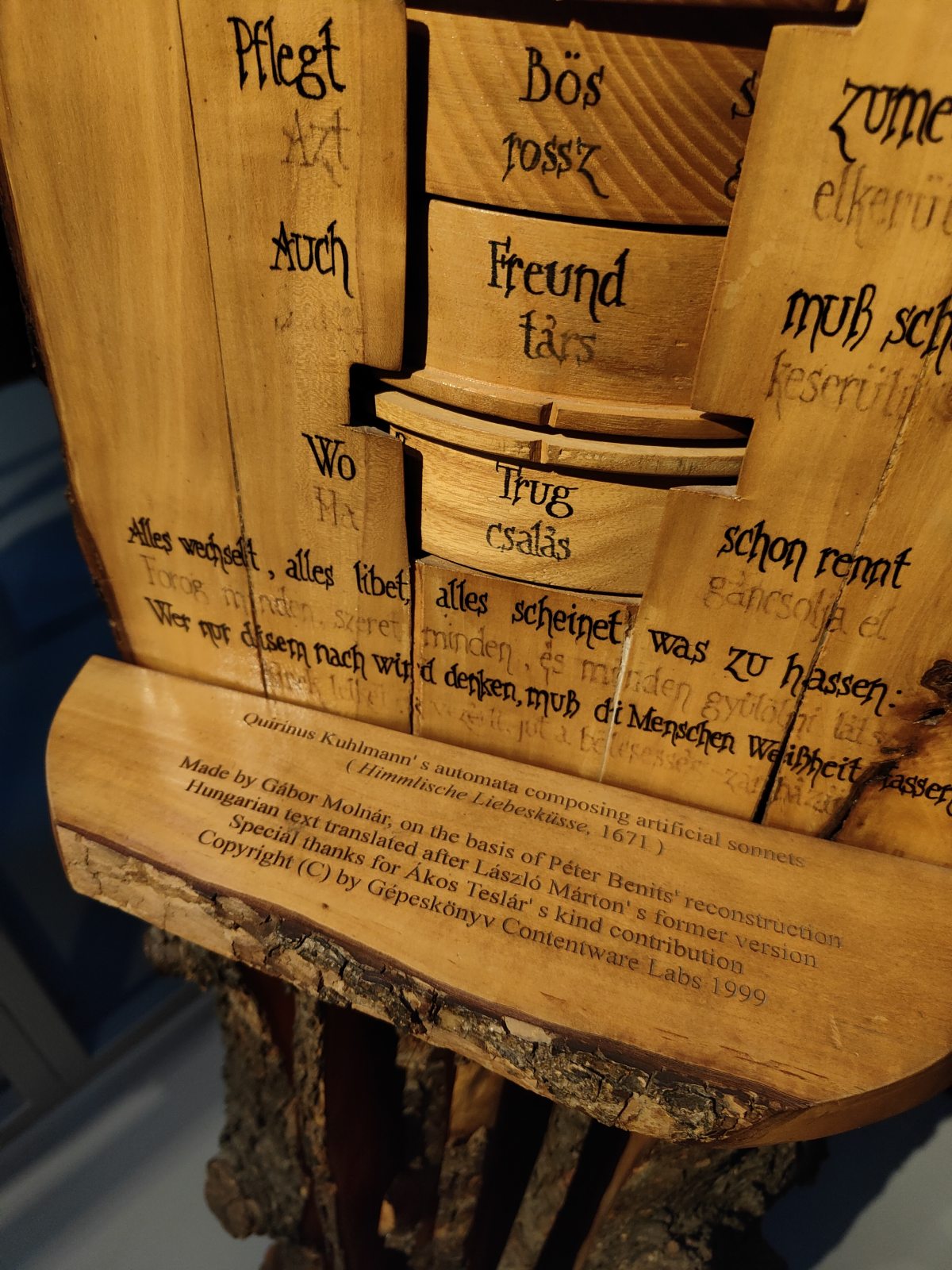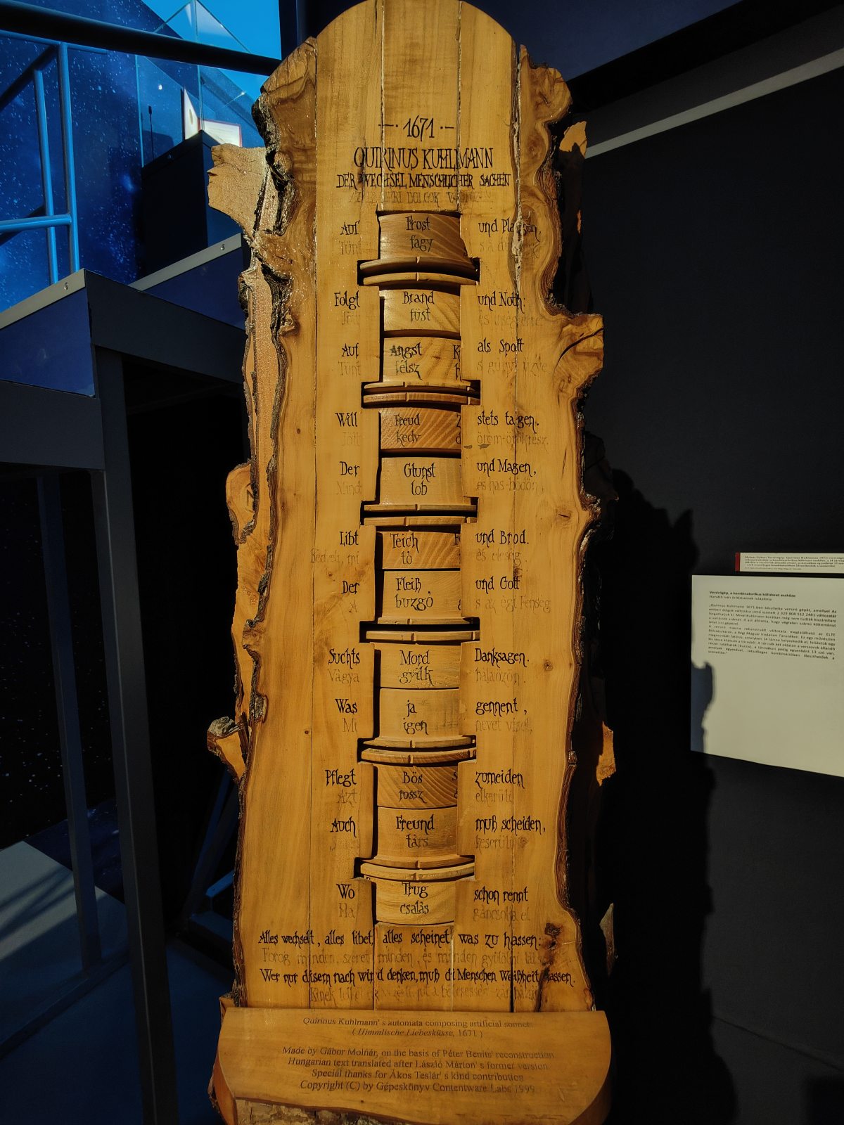 A kombinatorikus költészet nem új találmány: Kuhlmann fatörzsbe épített, tárcsás szerkezetének rekonstrukciójával bárki rímeket faraghat a Nemzeti Múzeumban.