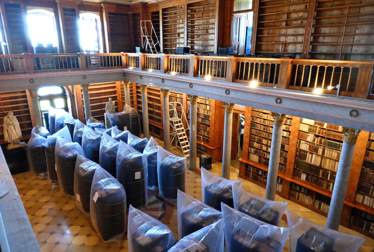 Hajdu Zsófia Edit restaurátor, a Pre-Con Restaurátor Kft. ügyvezetője elmondta, hogy a könyvállomány mintegy felét már ládákba emelték a polcokról és becsomagolták, előkészítve a fertőtlenítésre. A ládahalmokat igyekeznek úgy tenni, hogy a polcok és a könyvek sorrendje is megmaradjon a visszapakoláshoz. A ládahalmokat felfújt zsákokba emelik, amelyeket légmentesen lezárnak, és az oxigént nitrogénnel helyettesítik. A tervek szerint július 18-án fejezik be a könyvek csomagolását. Minimum hat hét szükséges ahhoz, hogy a rovarok és a lárvák elpusztuljanak. A fertőtlenítést követő száraz tisztítás a tervek szerint három hónapig tart majd. Minden könyvet megtisztítanak, akár sérült, akár nem. Egyelőre még nem lehet tudni, hogy az állomány hány darabja érintett a fertőzéssel – mondta.