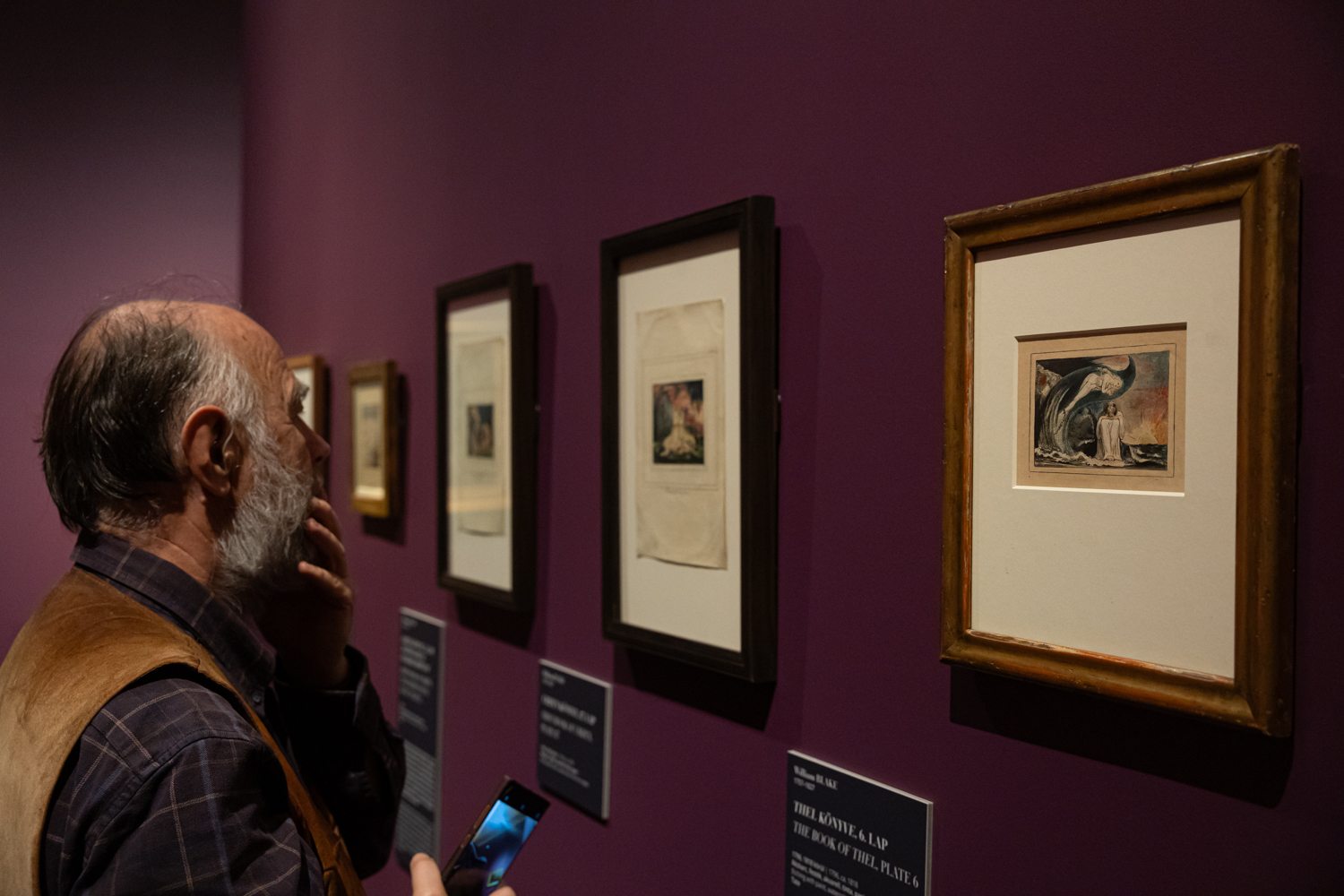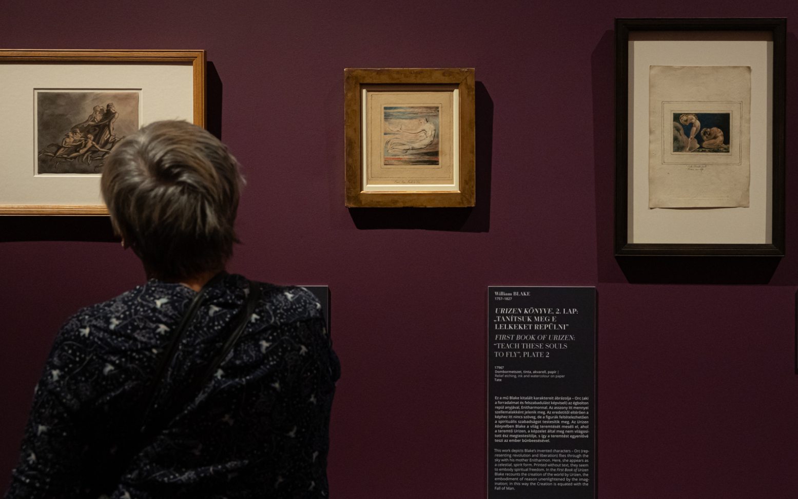 Nekünk, nézőkként pedig kifejezetten megrendítő szembesülni Blake grafikáival, amelyek egyébként érzékenységük folytán csak extrém rövid ideig lehetnek kiállítva. A kedvenceim azok a miniatűr, akvarellel és tintával készült lapjai – The Book of Thel, The First Book of Urizen vagy az Albion leányainak látomásai –, amelyeken a tünékeny vonalvezetés, a légiesen elmosódó színek és a lebegő alakok egyfajta csendes éteriséget árasztanak.