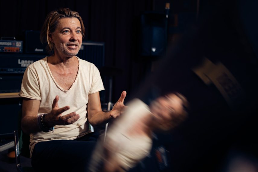 Beljebb lépünk – cipőben –, jönnek az izgalmak. A zenész az irányítószoba hatalmas keverőpultját mutatja, ami Európában az egyik legrégebbi, és analóg módon lehet rajta felvenni. „Még kell rajta bíbelődni, de a gombok többsége működik rajta.” Beck ezután belelendül, és egyre-másra veszi elő a különlegesebbnél különlegesebb hangszereket, mutatja az erősítőket, magyarázza, melyik mit tud. Bevallanám, hogy a felét nem értem annak, amit mond, de buzgón bólogatok, és egyik ámulatból esem a másikba, amikor ezeket a több évtizedes hangszereket megszólaltatja.